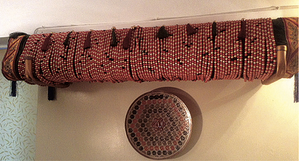 Based on the premise that what is said above, represents One day in the life of the author, a Tasbih (misbaha/rosary) project was undertaken (as depicted in the accompanying photographs), consisting of 100 bead-bands joined together, making up 21,600 beads, each bead representing individualized human breath. During the beading process, on each bead was invoked a Divine Name (from the conventional list of Asma al Husna-His Divine Names (attributes) enumerated in the Qur’ān), a sublime gesture of submission. The process was recorded in the author’s “Beading Diary” and it was completed with love, affection and dedication over 102 hours, just over a period of six weeks. Based on a mathematical calculation of the author’s life expectancy of 75 years, this gesture represents a meagre 0.01% of his life. This has been a joyous, illustrious and spiritually uplifting journey for the author.