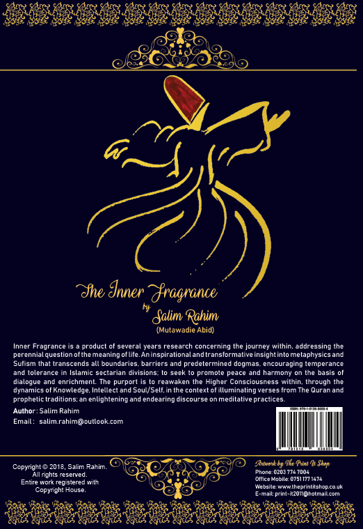 “Inner Fragrance” is a product of several years research concerning the journey within, addressing the perennial question of the meaning of life. An inspirational and transformative insight into metaphysics and Sufism that transcends all boundaries, barriers and pre-determined dogmas, encouraging temperance and tolerance in Islamic divides; to seek to promote peace and harmony on the basis of dialogue and enrichment. The purport is to reawaken the Higher Consciousness within, through the dynamics of Knowledge, Intellect and Soul/Self in the context of illuminating verses from the Qur’ān and prophetic traditions; an enlightening and endearing discourse on meditative practices.